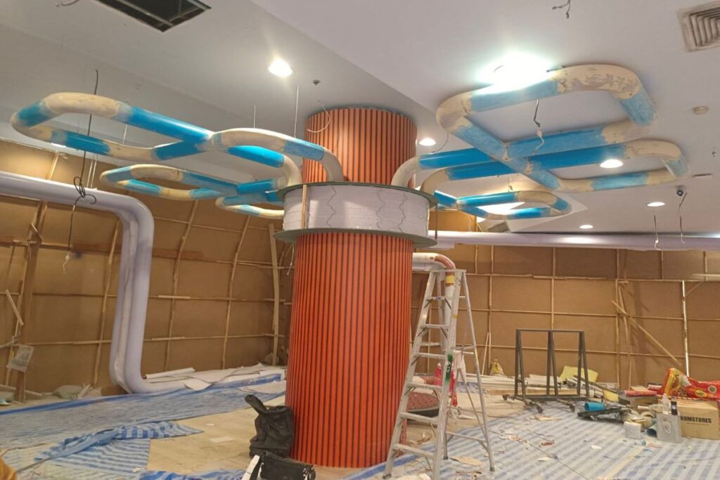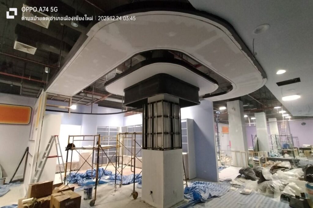ดำเนินการติดตั้งโครงสร้างแขวน (Hanging Support) สำหรับรองรับงานตกแต่งภายในพื้นที่สวนสนุก โดยออกแบบให้มีความแข็งแรง มั่นคง และสามารถรองรับน้ำหนักขององค์ประกอบตกแต่งได้อย่างปลอดภัย เหมาะสมกับลักษณะพื้นที่ FEC ที่มีการใช้งานต่อเนื่อง